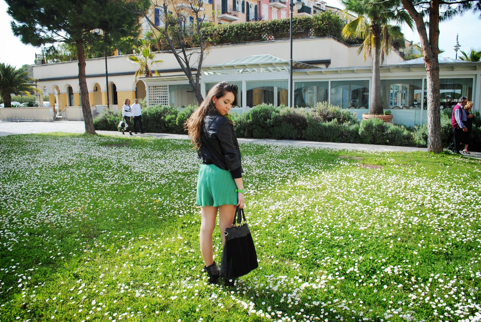 E' ora di indossare shorts, gonne e vestiti, ma soprattutto costumi... Per ora inizio con gli shorts plissé verdi che ho comprato in un negozio della mia città, abbinati ad una t-shirt nera semplicissima, bikers, borsa nera di Rocco Barocco, chiodo in pelle nero; ho arricchito questo outfit con un foulard vintage sempre nei toni del verde, e con degli orecchini a forma di croce, che ho indossato nel post precedente, con pietrine verdi. Adoro fare le foto in mezzo alla natura, in questo caso su un meraviglioso prato colmo di meravigliose margheritine bianche....splendido!